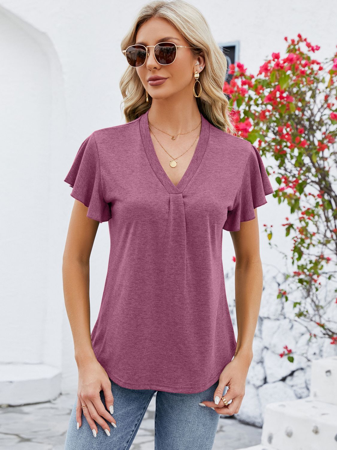 V-Neck Flutter Sleeve T-Shirt